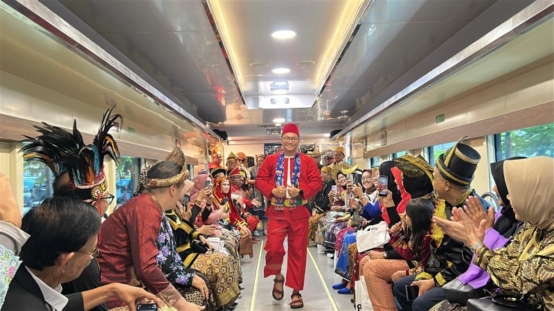 Tak kalah menarik, 30 peserta fashion show tampil memperagakan pakaian adat dari seluruh provinsi di atas kereta yang tengah melaju. Suasana makin hangat dengan alunan musik akustik. Catatan ini resmi jadi fashion show pertama di Indonesia yang digelar di atas kereta.