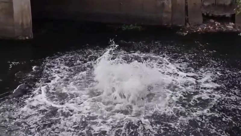 Surabaya – Sebuah semburan muncul di sungai samping jembatan persimpangan Rungkut Madya dan Rungkut Mapan, Kota Surabaya. Fenomena ini membikin warga sekitar heboh, karena luapannya membikin air bergelembung dan bergejolak.