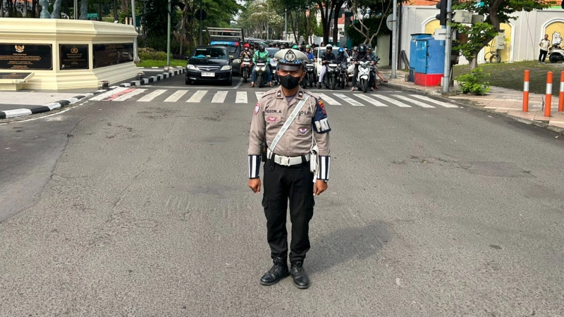 Petugas Satlantas Polrestabes Surabaya berdiri tegap di tengah jalan, mengenakan seragam lengkap. Mereka mengangkat tangan memberi isyarat hening. Dalam satu komando yang serentak, seluruh pengguna jalan pengemudi, ojek daring, hingga pejalan kaki turut larut dalam momen 60 detik penghormatan itu.