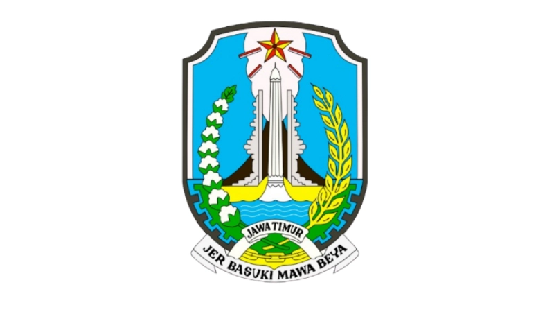Pita putih dengan nama provinsi JAWA TIMUR diapit dua roda gerigi Hijau dan di bawah rantai Emas.